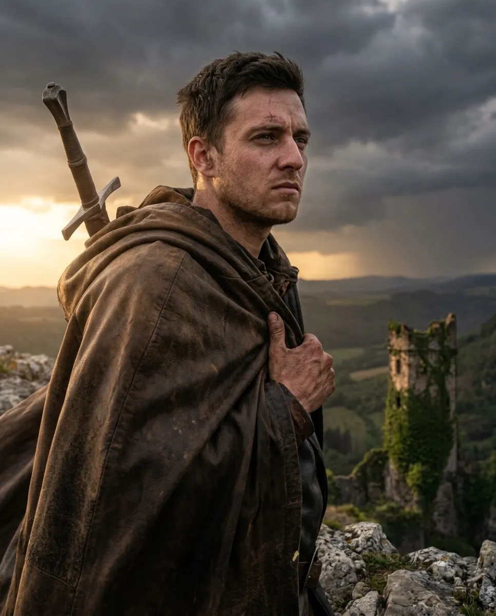 Скалы, плащ, меч за спиной — шторм на горизонте.